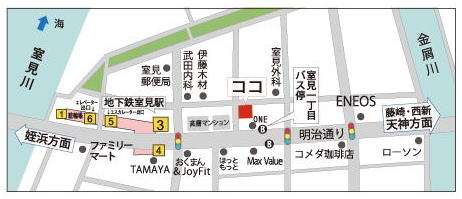 福岡空港線「室見駅」B出口徒歩1分。 B番出口が便利です。 B番出口を出て天神方向に横断歩道を渡り、高層マンション2棟を 通りすぎた角を左折。右側2軒目の赤レンガのビルの3Fです。 主要駅(地下鉄:福岡空港線)と室見駅間の乗車時間(参考)》