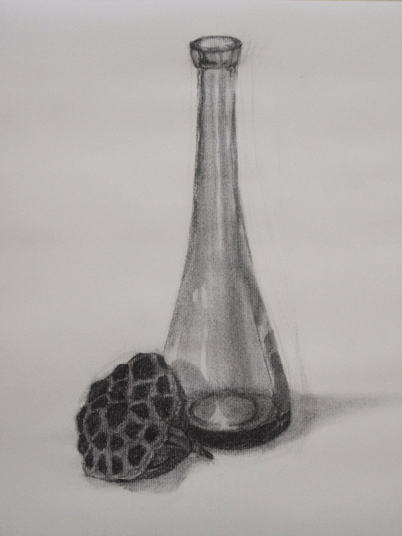 「蓮とガラス瓶」(木炭画 by YOSHINO)
