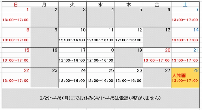 | ☆クガニールの1レッスンは、ゆったり 4時間! 人物・人体画レッスンは、隔月(一月おき)実施。 人物画(着 衣)レッスンは、2・6・10月 人体画(ヌード)レッスンは、4・8・12月 ◇実技3時間&講評1時間程度 ◇人物・人体画レッスンは、振替不可 ☆月&金曜日は休校。 ※『日付・曜日・時間』を確認して、予約してください。 スマホで表が見えない時は、パソコンモードにしてください。 2026年 3月レッスンスケジュール 2026年 2月レッスンスケジュール |