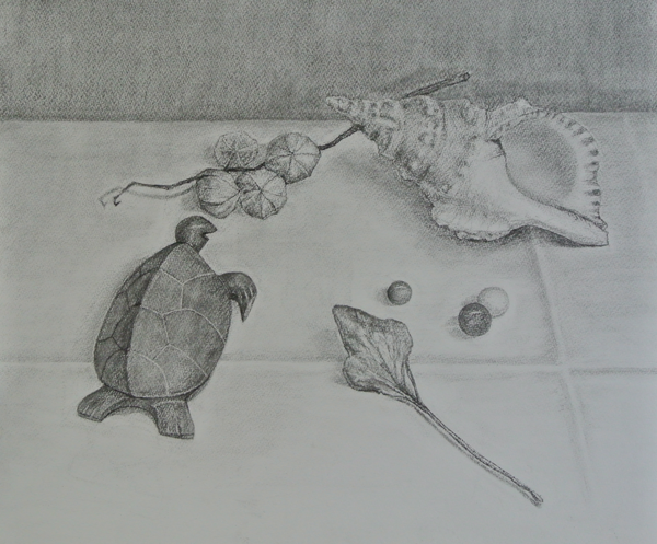 「カメの置物のある静物」 木炭 by HIWATASHI 2016年 1月