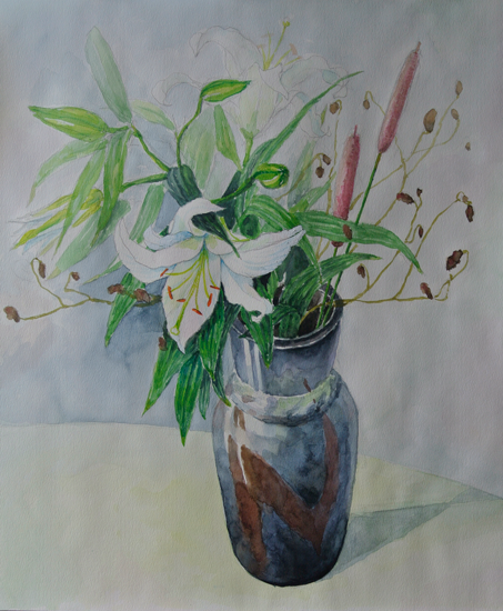 「百合と蒲」 透明水彩 by masako F 2013年7月
