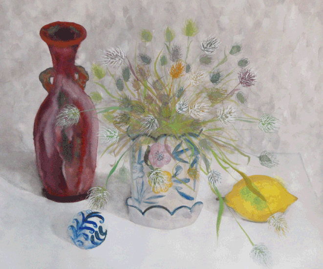 左の花瓶が少し強すぎますが、植物(ラビットテール)が心地よいリズムで表現された、魅力あふれる絵です。