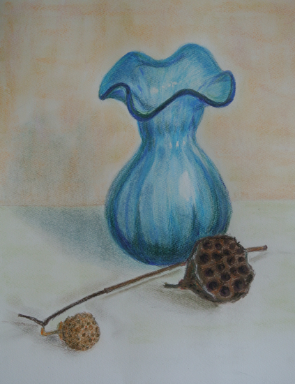 「青いガラス花瓶のある静物」 色鉛筆&パステル by misao I 2013年6月