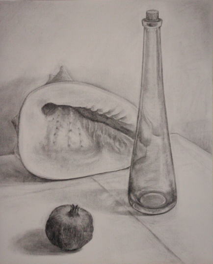 「ザクロ・瓶・貝」 木炭画 by yoshiko Ha (2012年3月)