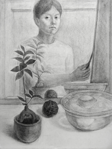 「静物と自画像」木炭 by noriko K 高3 (2026年 1月)